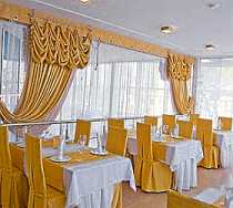 В зале ресторана "Бригантина" на первом этаже отеля вместимостью до 40 мест подаются блюда по меню, любое из которых можно заказать в номер. Банкетный зал "Панорама" на седьмом этаже гостиницы удобен для организации праздничных банкетов, фуршетов, торжеств по случаю свадьбы или юбилея и корпоративных праздников. Зал может одновременно принять до 140 гостей.