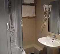 В ванной комнате - душевая кабина и фен, зеркало и туалетные принадлежности.