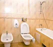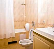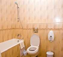 В ванной комнате: туалет, раковина, ванна, фен, туалетные принадлежности, комплект полотенец.