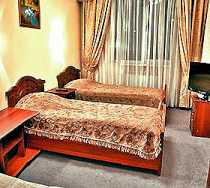 В оснащение стандартного номера входят две односпальные кровати, телевизор, мини-холодильник, телефон, электрический чайник, чайный набор, душевая кабина, фен для сушки волос, халат и тапочки.