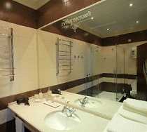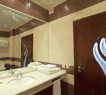 В ванной комнате - современная сантехника, душевая кабина, фен, набор косметики, халаты и полотенца, тапочки.