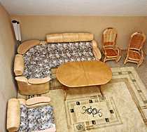 В холле - обеденный стол, стулья, диваны, телевизор, DVD, магнитофон, внутренний телефон, холодильник, чайник, СВЧ-печь, набор посуды и столовых приборов. У коттеджей есть веранды или беседки с видом на Волгу и мангалы.