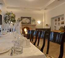 На первом этаже расположился уютный ресторан с камином и тремя залами, где гости всегда могут вкусно пообедать или поужинать. Меню предлагает широкий ассортимент блюд европейской и русской кухонь, десерты, закуски и напитки. Блюда и напитки также можно заказать с доставкой в номер. Ресторан рассчитан на 150 посадочных мест и специализируется на проведении фуршетов, банкетов, корпоративных праздников, свадеб, юбилеев и других коллективных мероприятий.