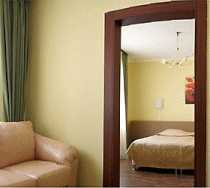 В улучшенных номерах дополнительно - зона отдыха с мягкой мебелью и кофейным столиком.