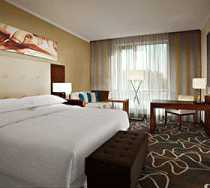 Классический дизайн в современной интерпретации - отличительная черта бренда Sheraton™. Интерьеры номеров оформлены в теплых тонах с отделкой из современных материалов. Мебель отделана натуральным шпоном американского ореха, в оформлении ванной комнаты использованы керамическая плитка и итальянский мрамор. Расположенный на 10-м этаже Президентский люкс площадью 146 квадратных метров включает в себя просторную гостиную с камином и библиотекой, спальню и просторную ванную комнату с джакузи.