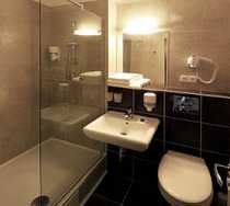 В ванной комнате: душ, раковина, туалет, средства личной гигиены, фен.