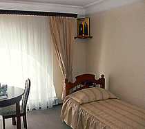 В оснащение стандартного номера входит односпальная кровать, прикроватная тумба, настольный светильник, стол, стул, платяной шкаф, вешалка, багажница, зеркало, аксессуары для одежды и обуви, телефон, стаканы, икона, духовная литература, информационная папка, чайная пара, электрический чайник.