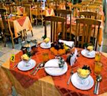 Для гостей организовано пятиразовое диетическое питание. Доступны заказные блюда по меню, а в летний период - питание по типу шведский стол. Столовая рассчитана на 280 посадочных мест. Также для гостей работают банкетный зал, бары и кафе.